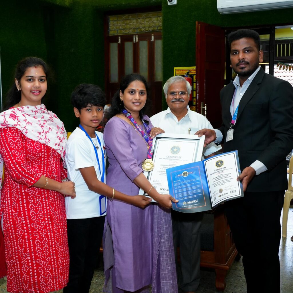 MRS. JAYANTHI VINOTHKUMAR (D.O.B: 10.09.1992) [GEEDA ACADEMY] SALEM, TAMILNADU, INDIA , has performed “MAXIMUM NUMBER OF PARTICIPANTS SOLVING 600 ABACUS SUMS IN 54 MINUTES WHILE BLINDFOLDED”. This attempt had considered & registered as Nobel World Records.