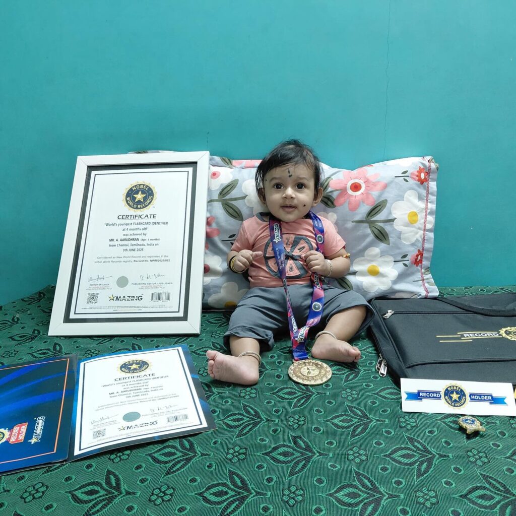 Mr. A.Aarudhran (Age : 4months) Chennai, Tamilnadu, India has performed “World’s Youngest Flashcard Identifier at 4 Months Old”. This attempt had considered & registered as Nobel World Records.